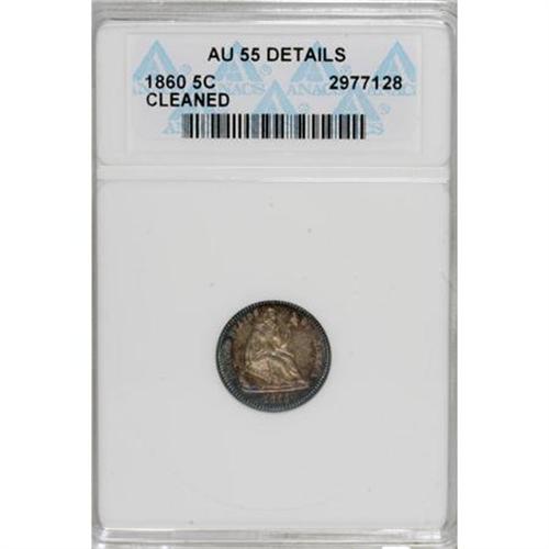 <B>1860 H10C --Cleaned--ANACS. AU55 Details.</B></I> NGC Census: (8/417). PCGS Population (10/379). Mintage: 799,000. Numismedia Wsl. Price for NGC/PCGS coin in AU55: $100. (#4377)<BR><BR><b>Shipping:</b> Coins & Currency (<a target="_blank" href="http://www.heritageauctions.com/common/shipping.php">view shipping information</a>)