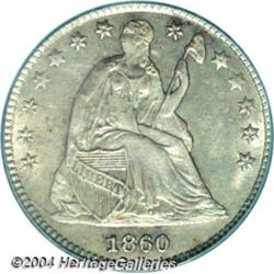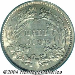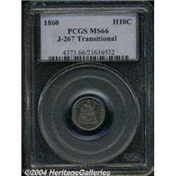 <B>1860<H10C> J-267 Transitional MS66 PCGS.</B></I> During the years 1859 and 1860 interesting half dime patterns were made which do not bear the nation's identity. These are transitional pieces, not made for circulation, but struck at the time the inscription UNITED STATES OF AMERICA was being transferred from the reverse to the obverse. The stars of both the 1859 and 1860 issues are hollow. This example features speckled aqua blue, olive, crimson, violet, and gold toning over lustrous surfaces. Sharply impressed, save for weakness on the bow knot. The surfaces of this fabulous coin are virtually unblemished. Population: 6 in 66, 7 finer (7/04). <BR><BR><B>Important notice:</B> Heritage usually auctions material at the rate of 200-250 lots per hour. On some occasions eBay Live bid software or the Internet may not be able to keep up with the pace of the auction. We recommend placing a realistic absentee bid now as insurance to avoid disappointment. Occasionally the auctioneer may eliminate or reject an eBay Live bid, and the auctioneer may also reopen a lot after the close of the eBay live bidding (usually because we missed an audience bid), and may reject your bid even if it shows you as the winning bidder. By bidding via eBay Live, you agree that Heritage may award the lot to another bidder at its sole discretion under the circumstances described above or any other reasonable circumstances. Since eBay bids are not shown to us until we open the lot on the floor, we treat those bids just like floor bids. In most cases the floor responds before the eBay bid is presented to us, due to Internet lag time, so for consistency we have made it a policy that floor bids are always considered first over tie eBay live bids. Also please note that all Heritage lots purchased through eBay Live carry a 20% Buyer's Premium. Please make sure you read the Terms and Conditions before you bid. </span></font></tr></table></td></tr></table>
