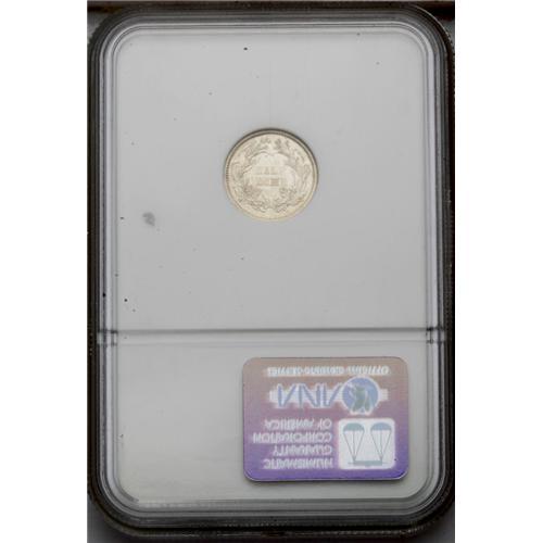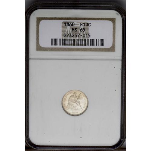 <B>1860<H10C> MS65 NGC.</B></I> V-3. A well struck example of this first-year issue from the Legend Obverse series. Mostly brilliant with flashy, frosty surfaces that are free from all but the tiniest abrasions. An arc of pastel tan coloration occurs over the upper third of the left obverse. It is hard to imagine a more pleasing example of this popular issue. Possibly a late die state of Breen-3099, with repunching still evident on 1, but not on 0. A sizeable lintmark (as struck) crosses through the lower loop of the 6 in the date. <BR><BR><B>Important notice:</B> Heritage usually auctions material at the rate of 200-250 lots per hour. On some occasions eBay Live bid software or the Internet may not be able to keep up with the pace of the auction. We recommend placing a realistic absentee bid now as insurance to avoid disappointment. Occasionally the auctioneer may eliminate or reject an eBay Live bid, and the auctioneer may also reopen a lot after the close of the eBay live bidding (usually because we missed an audience bid), and may reject your bid even if it shows you as the winning bidder. By bidding via eBay Live, you agree that Heritage may award the lot to another bidder at its sole discretion under the circumstances described above or any other reasonable circumstances. Since eBay bids are not shown to us until we open the lot on the floor, we treat those bids just like floor bids. In most cases the floor responds before the eBay bid is presented to us, due to Internet lag time, so for consistency we have made it a policy that floor bids are always considered first over tie eBay live bids. Also please note that all Heritage lots purchased through eBay Live carry a 20% Buyer's Premium. Please make sure you read the Terms and Conditions before you bid. This lot is being auctioned in conjunction with a live floor auction by Heritage Galleries & Auctioneers. All final auction and invoice information will be supplied by Heritage Galleries & Auctioneers, and all other information should be considered preliminary. Lot:1900 <BR><BR><B>Winning Notification and Billing:</B> After the FINAL session in this auction is complete, Heritage will send e-mail and snail mail invoices. This process normally takes several days. All final auction and invoice information will be supplied by Heritage Galleries & Auctioneers, and all other information should be considered preliminary. <BR><BR>This auction will be conducted on a live auction floor and over the Internet through eBay Live. If you choose to place an absentee bid, please take a moment to <font color='#0000ff'><u><a href='http://pages.ebay.com/liveauctions/help/before/laabsentee.html'>learn how eBay Live absentee bidding works</a></u></font><font color='#000000'>