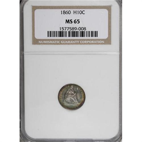 <B>1860 H10C MS65 NGC.</B></I> Multicolored toning bathes the lustrous surfaces of this Gem half dime. Sharply struck, with no significant marks to report.<BR><I>From The Madison Collection.</B></I><BR><BR><B>Coin Engraver:</B> Christian Gobrecht<BR><BR><b>Shipping:</b> Coins & Currency (<a target="_blank" href="http://www.heritageauctions.com/common/shipping.php">view shipping information</a>)