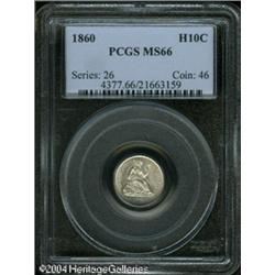 1860 H10C MS66 PCGS. A brilliant and flashy premiu <B>1860 H10C MS66 PCGS.</B></I> A brilliant and flashy premium Gem that is well struck aside from the left tip of the wreath. Mint-made clash marks are present on each side, as is customary for the era. The first year of the Legend variety. Population: 49 in 66, 32 finer (10/04). <BR><BR><B>Important notice:</B> Heritage usually auctions material at the rate of 200-250 lots per hour. On some occasions eBay Live bid software or the Internet may not be able to keep up with the pace of the auction. We recommend placing a realistic absentee bid now as insurance to avoid disappointment. Occasionally the auctioneer may eliminate or reject an eBay Live bid, and the auctioneer may also reopen a lot after the close of the eBay live bidding (usually because we missed an audience bid), and may reject your bid even if it shows you as the winning bidder. By bidding via eBay Live, you agree that Heritage may award the lot to another bidder at its sole discretion under the circumstances described above or any other reasonable circumstances. Since eBay bids are not shown to us until we open the lot on the floor, we treat those bids just like floor bids. In most cases the floor responds before the eBay bid is presented to us, due to Internet lag time, so for consistency we have made it a policy that floor bids are always considered first over tie eBay live bids. Also please note that all Heritage lots purchased through eBay Live carry a 20% Buyer's Premium. Please make sure you read the Terms and Conditions before you bid. This lot is being auctioned in conjunction with a live floor auction by Heritage Galleries & Auctioneers. All final auction and invoice information will be supplied by Heritage Galleries & Auctioneers, and all other information should be considered preliminary. Lot:5686