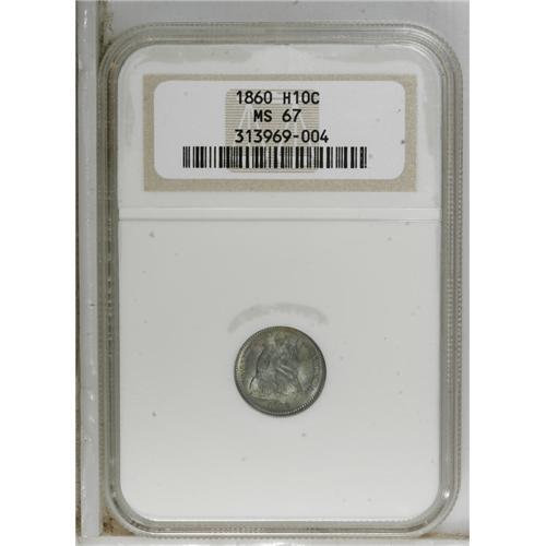 <B>1860 H10C MS67 NGC.</B></I> Mint-green, ocean-blue, jade, and russet hues grace both sides of this phenomenal Superb Gem. Despite the presence of the deep toning, much luster remains, and the effect is quite startling. Few survivors can match the present piece, much less supersede it, as NGC has certified only five pieces better, with two finer at PCGS (4/07). Close perusal with a loupe fails to reveal a single distraction. Some light clash marks are noted on the reverse, joining the wreath tips, from the base of the rock on the obverse.<BR><BR><b>Shipping:</b> Coins & Currency (<a target="_blank" href="http://www.heritageauctions.com/common/shipping.php">view shipping information</a>)