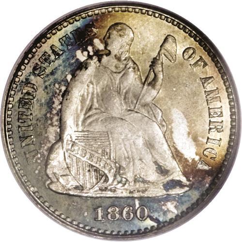 <B>1860 H10C MS67 PCGS.</B></I> Highly lustrous, near-pristine surfaces drip with splashes of cobalt-blue, golden-brown, and lavender toning around portions of the borders, and the design elements are well brought up. A small planchet defect is noted in the lower right obverse border. This truly attractive Superb Gem has superior quality and great aesthetic appeal. Population: 31 in 67, 2 finer (10/06).<BR><BR><b>Shipping:</b> Coin/Currency (<a target="_blank" href="http://www.heritageauctions.com/common/shipping.php">view shipping information</a>)