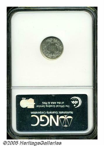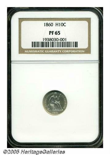 <B>1860<H10C> PR65 NGC.</B></I> This lovely proof is virtually untoned, and possesses nearly pristine surfaces that display just a few minute marks in the center of the reverse field. All of the design elements exhibit excellent definition. Population: 17 in 65, 11 finer (6/05).