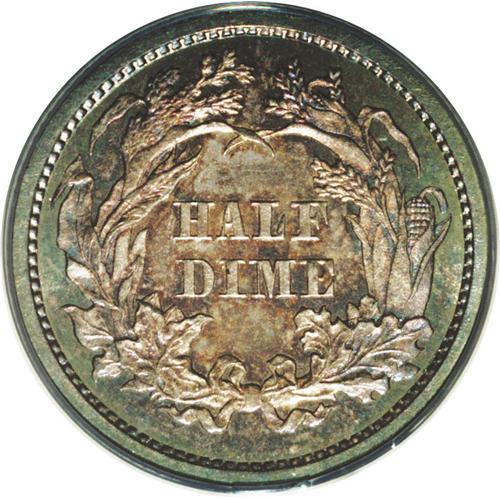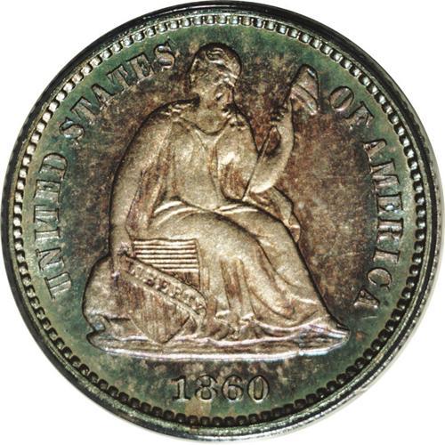 <B>1860<H10C> PR66 ANACS.</B></I> First year of the Legend Obverse design, with a net of 535 proofs struck. This is a nicely reflective example that shows bright cobalt-blue toning around the margins and scarlet-gray color in the interior portions of each side. A lovely and originally toned example of this first-year type.