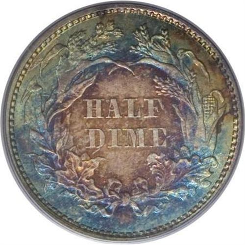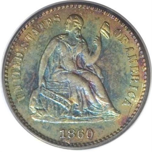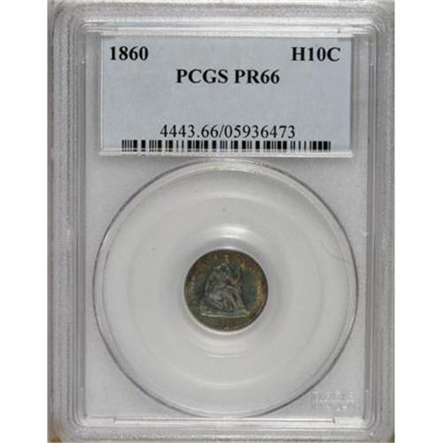 <B>1860 H10C PR66 PCGS.</B></I> Ocean-blue, gold, and cherry-red endow this colorful specimen. The strike is sharp except for the usual slight blending on the upper left portion of the wreath. A pair of hair-thin obverse marks are noted at 12 and 4 o'clock. The first year of the Legend Obverse type. Population: 7 in 66, 2 finer (4/07).<BR><BR><b>Shipping:</b> Coins & Currency (<a target="_blank" href="http://www.heritageauctions.com/common/shipping.php">view shipping information</a>)