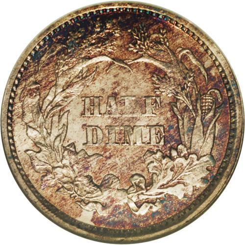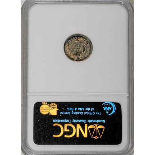 <B>1860 H10C Transitional MS64 NGC.</B></I> Judd-267, Pollock-315, R.4. A well-known and popular muling of the Type of 1859 obverse and Type of 1860 reverse subtypes. UNITED STATES OF AMERICA is omitted, since it was in transition from the reverse to the obverse between 1859 and 1860. The Transitional issue also has the curious hollow-center obverse stars, found on the 1859 half dime. This piece has attractive russet, plum, and navy-blue toning. Typically struck but beautifully preserved. Census: 11 in 64, 25 finer (11/06).<BR><BR><b>Shipping:</b> Coin/Currency (<a target="_blank" href="http://www.heritageauctions.com/common/shipping.php">view shipping information</a>)