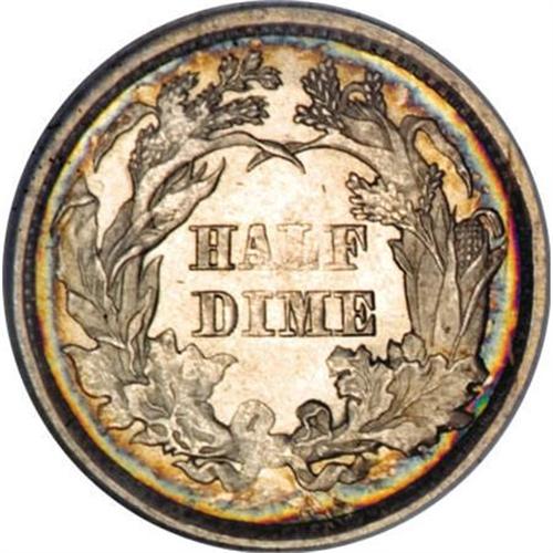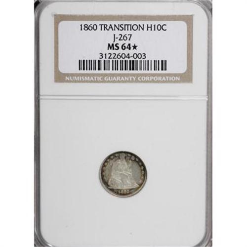 <B>1860 H10C Transitional MS64 <img src="/images/star.gif" width="10" height="10" alt="" border="0"> NGC.</B></I> Judd-267, Pollock-315, R.4. Traditionally collected as part of the Seated half dime series, although in fact a mule that lacks the country name, UNITED STATES OF AMERICA. The obverse subtype of 1859, with hollow obverse stars, is paired with the cereal wreath reverse of 1860. NGC has awarded a Star for the peripheral toning, which displays ruby-red, jade-green, gold, and ice-blue. Softly struck, but prooflike and essentially immaculate.<BR><I>From The John Stimson, Sr. Collection, Part Two.</B></I><BR><BR><b>Shipping:</b> Coins & Currency (<a target="_blank" href="http://www.heritageauctions.com/common/shipping.php">view shipping information</a>)