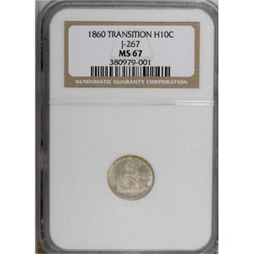 <B>1860 H10C Transitional MS67 NGC.</B></I> Judd-267, Pollock-315, R.4. Considered a pattern by tradition, the Transitional half dime was actually issued by James Ross Snowden as "trade bait" to help enhance the Mint Collection. Most collectors today include it as a part of the Seated half dime series. It is believed that the Philadelphia Mint produced about 100 of these coins early in 1860. Since the obverse retained the stars of the 1838-1859 issues and the reverse was that of the 1860-1873 issues, these fascinating coins do not bear the legend UNITED STATES OF AMERICA. The stars of both the 1859 and 1860 issues are hollow. This is a wholly original example with bright silver-gray, lustrous surfaces. The strike is well above average for the issue, with most of the design elements well impressed. Only a couple of stars along the upper right obverse border reveal softness in the centers. Even the leaves on the reverse wreath display nice detail. The pristine surfaces are immaculately preserved, with no mentionable contact marks. An excellent opportunity for the advanced Seated Liberty half dime specialist, this lovely Superb Gem should command a generous bid. Census: 3 in 67, 1 finer (8/07).<BR><BR><b>Shipping:</b> Coins & Currency (<a target="_blank" href="http://www.heritageauctions.com/common/shipping.php">view shipping information</a>)