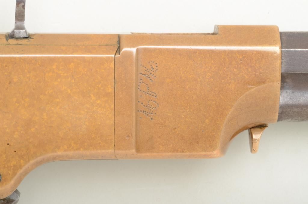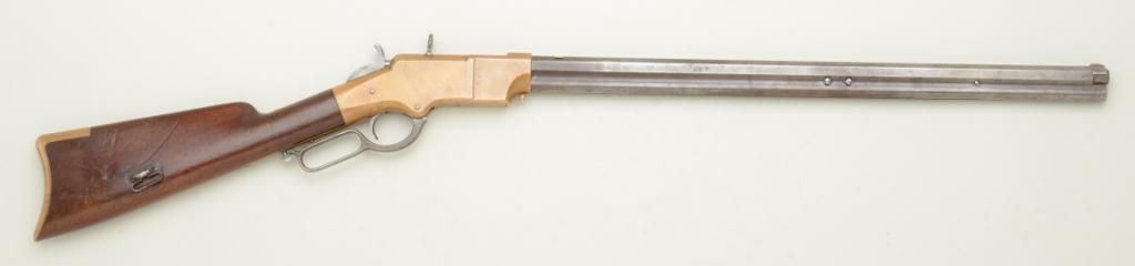 1860 Henry rifle, .44 rimfire cal., in very good+ original condition, showing early style sling swivels mounted on right side of stock with butt stock swivel mounted low, almost to the belly, serial #1502. Fifty Henryrifles in the 1300-2100 serial number range for issue to the 1st D.C. Cavalry and were shipped to the Ordinance Department June 19, 1863. These Henrys were taken from commercial inventory and were not inspected. This rifle has been in possession of the Wands family of Southern California since it was carried by their ancestor during the Civil War; whose initials "W.J.W." are punch dot inscribed on the right side of thereceiver in front of the sideplates and below the ejection port. The left side of the butt plate shows engraved initials "L.W." which was a successive owner and family member. Our consigner is an elderly retiredpolice officer who will supply an affidavit to this effect; however he was unable to find any listing of his ancestors' branch of service. The barrel retains 20%+ original blue mixed with a browning patina, some