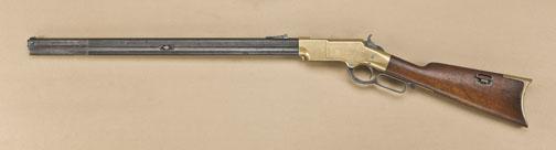 1860 Henry rifle, .44 rimfire caliber, in good to very good condition, showing sling swivels. Serial #10350. The barrels show 10-20% original blue drifting to a light brown patina with scattered light to moderate erosion and pinprick pitting, showing just normal age. The barrel address is good, the edges fairly sharp. The frame is good with some small marks, good fit to the sideplates, and its original full dimensions. The hammer and lever show some pitting and traces of case hardening. The stock has been lightly refinished and is slightly undersized. The action is good, the bore is good. The gun works and would load properly. There is someblue on the firing pin and inside the hammer well. The bottom of frame is stamped with hand-held die stamps beneath the lever “E. S. Hearing”, which is an old stamp. Also stamped “9.12.1882”. Buttplate serial numbermatches to the stock. Est: $14,000 - $28,000