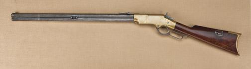 1860 Henry rifle, .44 rimfire caliber, in very good original condition showing considerable original blue finish, serial #11705. The barrel shows 10-20% original blue, mostly in the groove, scattered on the edges, and the balance drifting to a light patina, with some scattered erosion pinprick pitting just starting. Some faint traces of bright blue where protected. The barrel address is sharp, the edges very crisp, the original rear sight and sling swivels are retained. The frame and buttplate shows a light uncleaned patina with very sharp edges to the frame and tight fit to the sideplates. The hammer shows 20-30% case hardening, the stock is very good plus showing impeccable fit, Henry bump beneath the swivel, some minor scratches, marks, but generally exceptionally good overall with just some minor normal use and slight imperfections. The stock and buttplate are matching, the original small parts are retained. The action is good, the bore is good to very good. A very nice and original Henry with an exceptional frame and stock. Est: $20,000 - $40,000