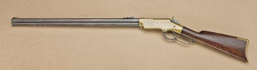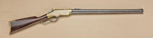 1860 Henry rifle, US martially marked and inspected, .44 caliber rimfire, serial #3137. The barrel shows CGC inspection, the frame shows H and C inspection on right front of frame. The barrel shows a dovetail through the center of the barrel address where sight had been moved forward and relocated. The barrel shows a brown patina finish with traces of blue mixed in with some dings, mars at the edges, but generally good. Some light cleaning and slight recoloring. The barrel address is light but mostly legible. The frame shows some wear at the edges, slight prying at the sideplates, but generally good with a medium patina. The stock shows no evidence of cartouche, some dings, mars, scratches, even wear, a couple of dents, some wear at the toe and some oil staining but generally good. The buttplate, the frame, the barrel, and the buttstock all match to #3137. The rear sight is a high quality replacement, and original small parts are retained. Some screws are numbered to match and a few unnumbered possible old replacements. An above average Martial Henry with just some normal wear, carry, use, and repositioning of the sight which is common. Est: $17,500 - $35,000
