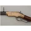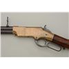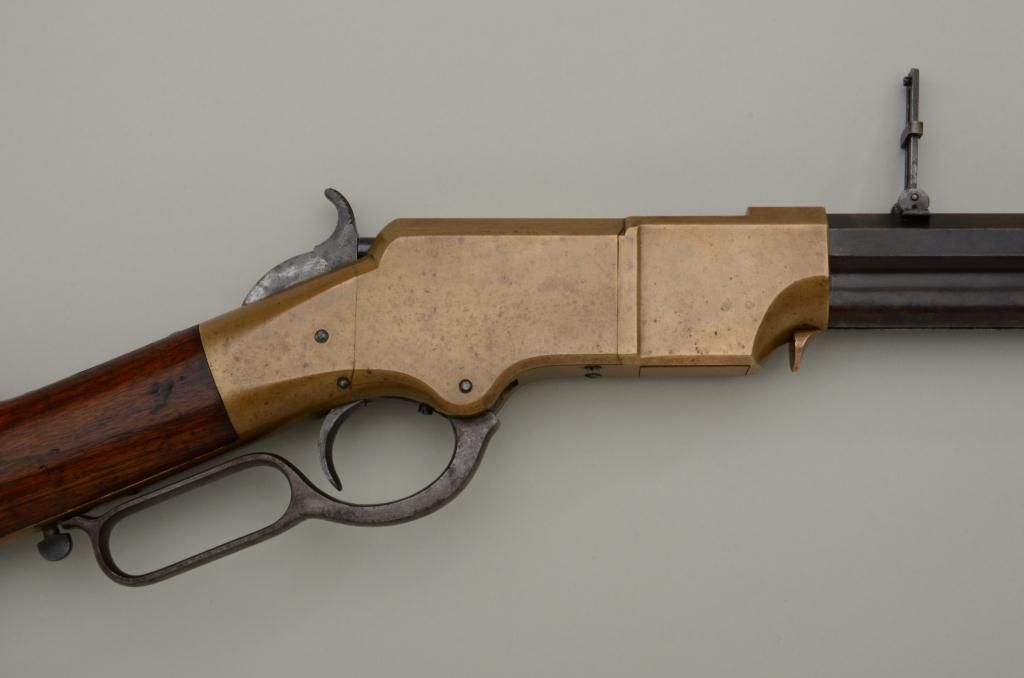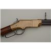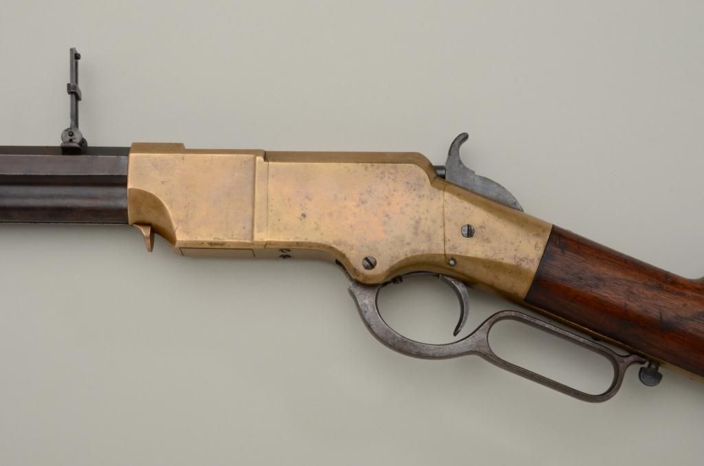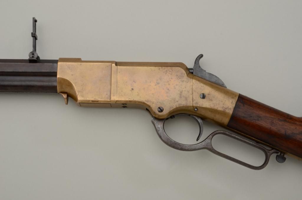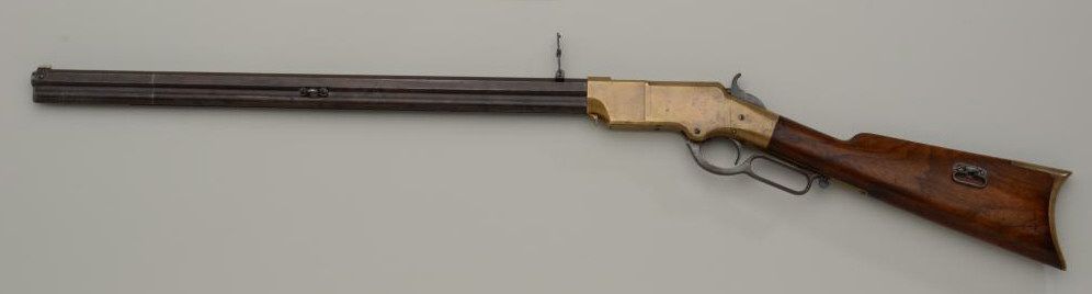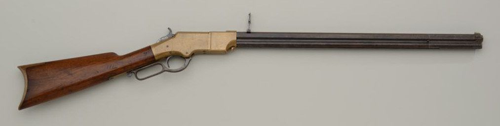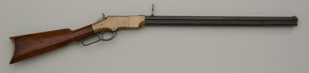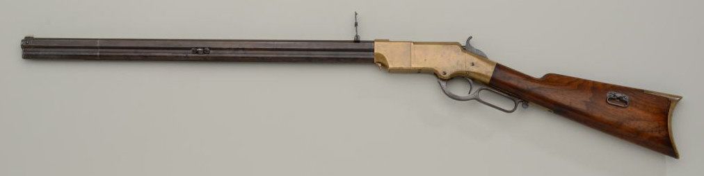 1860 Henry rifle in very good plus condition showing considerable original blue, serial number 10383, all matching serial numbers. The barrel shows 20% to 30% original blue mixed in with a natural uncleaned brownpatina finish. The markings are very crisp, edges are sharp and there has been no cleaning in modern times. There are some minor dents and scratches and just normal aging. There is a small amount of pitting and erosion but all in all the barrel and forward magazine area are very crisp. The original sights are retained. The frame is very sharp with a light patina and great fit to side plates. The brass shows sharp edgesand no evidence of polishing in modern times. The hammer, lever and small parts show strong traces of original finish. The stock is very good plus with 75% to 85% original varnish, some minor scratches, mars, dingsand just normal aging. The wood to metal fit is very good. The stock and butt plate are matching. The rifle is fitted with original to the period sling swivels. The action works well and the bore is amazingly bright in at