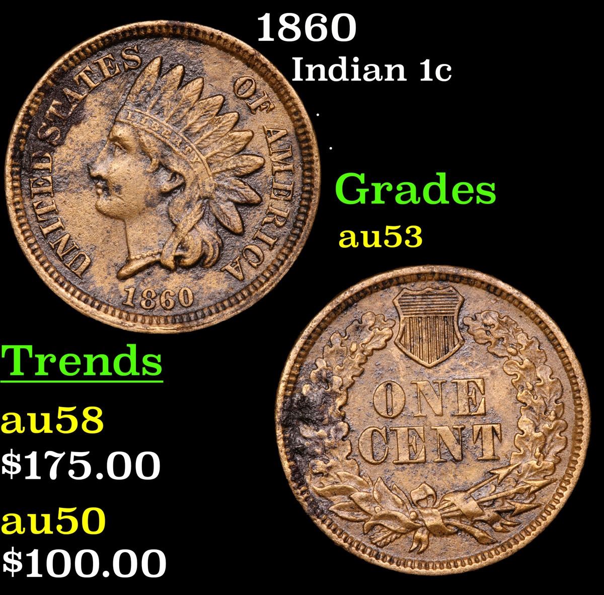 1860 . . Indian Cent 1c Grades Select AU.