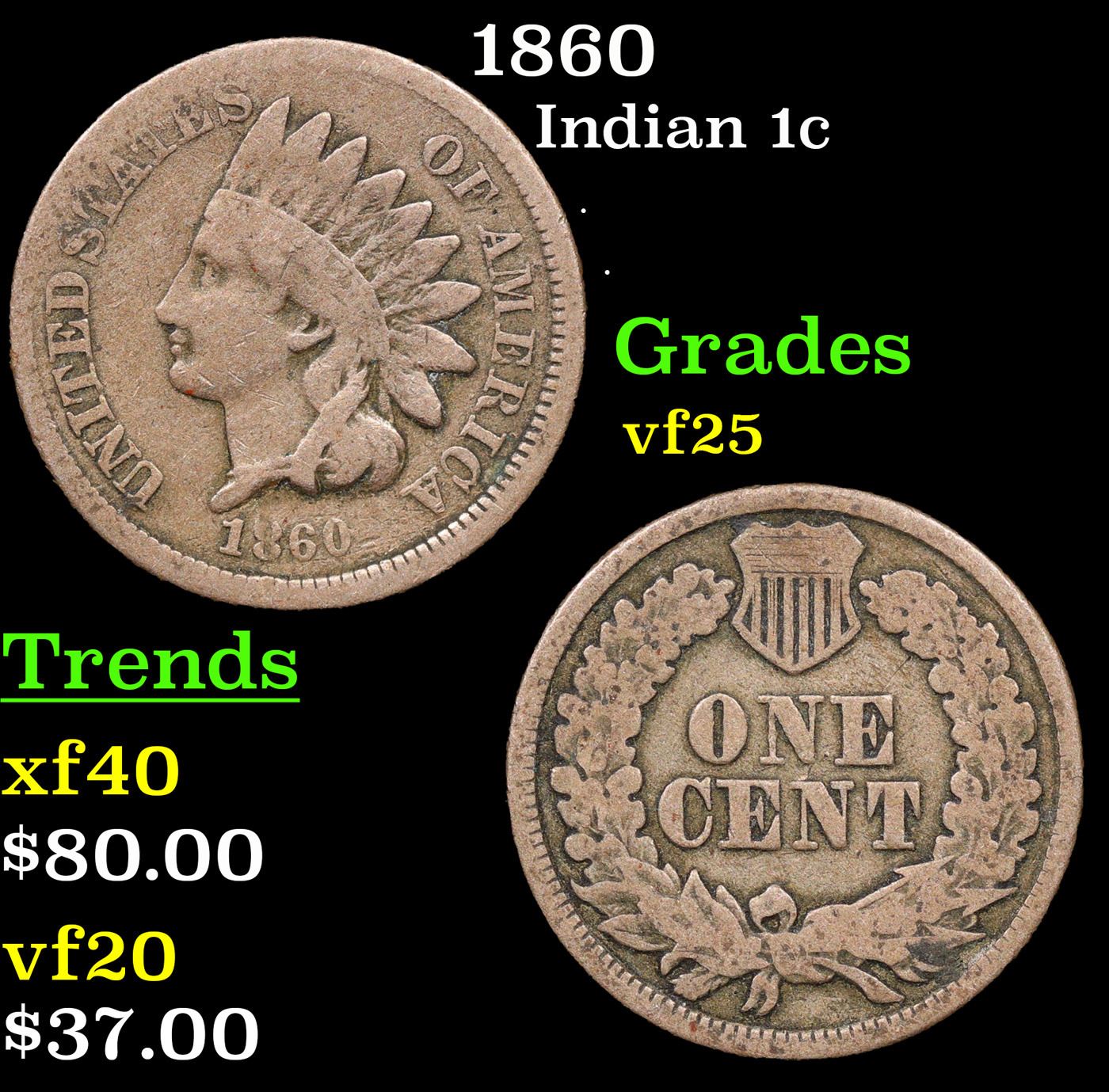 1860 Indian Cent 1c Grades vf+.