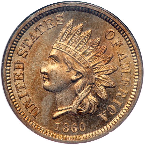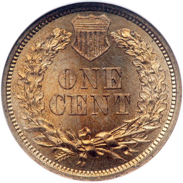 1860 Indian Head Cent. NGC graded MS-66. The shield adopted for 1860 and used on the coin until 1909 is simple in design - 13 vertical stripes, or the paleways, surmounted by a set of horizontal lines, or chief.