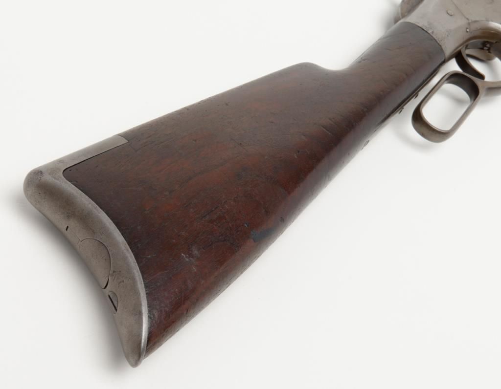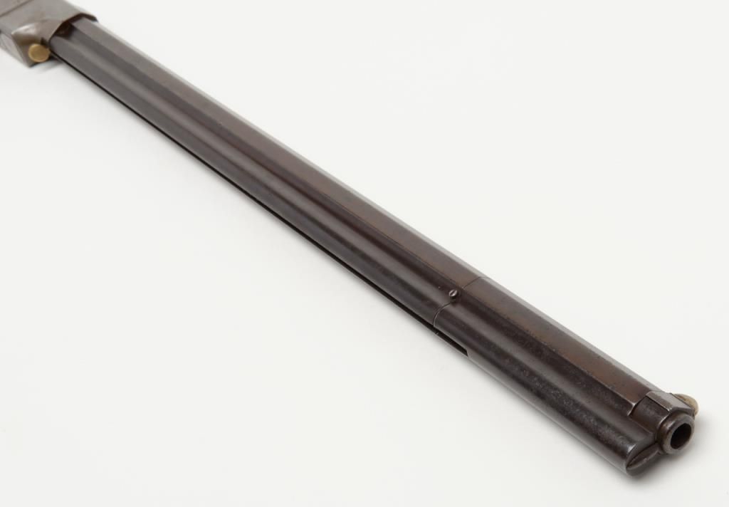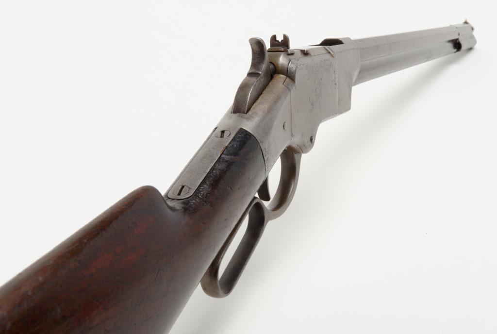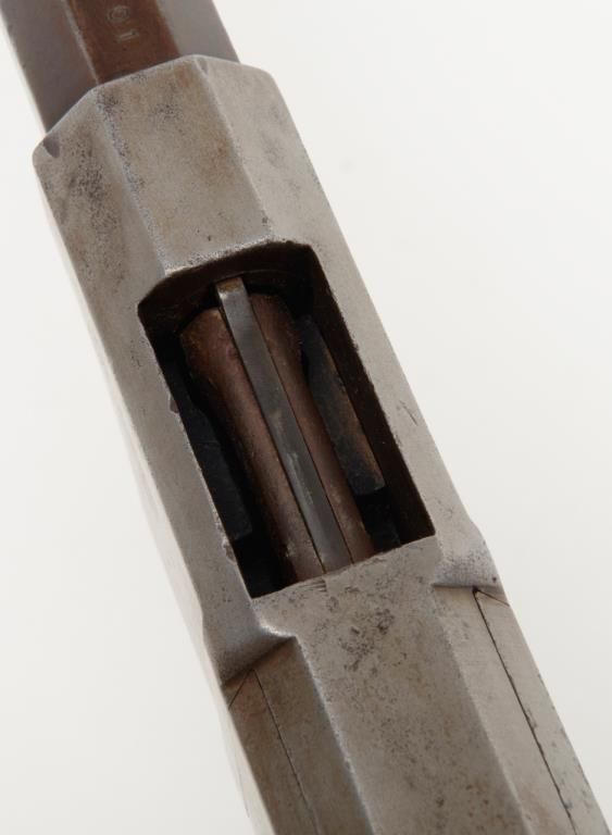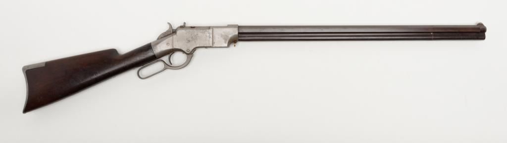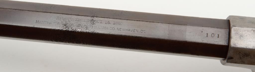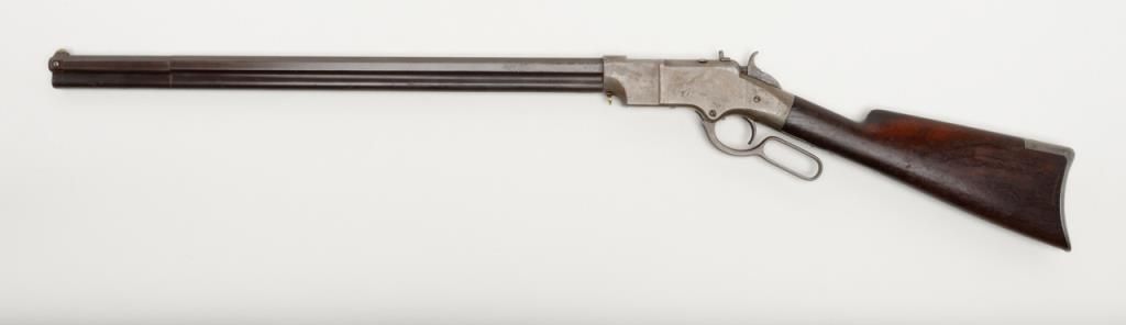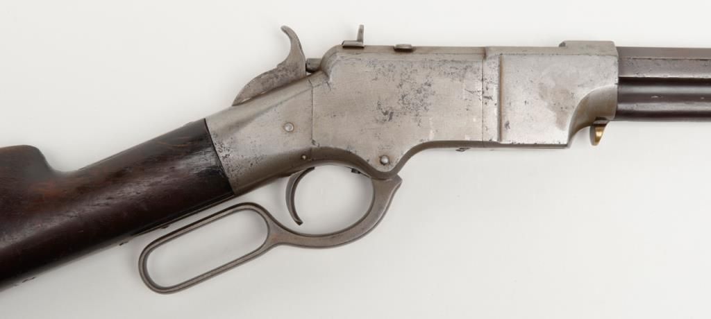 1860 Iron Frame Henry rifle, serial number 101. The Iron frame shows the rear sight dove tail plugged with some cleaning and browning applied long ago but not unsightly and a well done restoration. The frame and butt plate show somelight cleaning with minor pitting. There has been a plug placed in the rear sight dovetail and a frontier era buckhorn inleted in the frame near the back edge which was added during the period of use. The barrel address is light but legible. The action works well and the stock is good plus with minor normal aging and small imperfections. The stock and butt plate match. Recorded in “The Henry Rifle Book” by Les Quick as “One of approximately 50 known specimens of which only 270 wereestimated to have been produced”. With a large research portfolio included. Est.: $60,000-$120,000