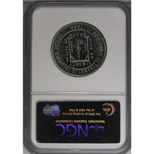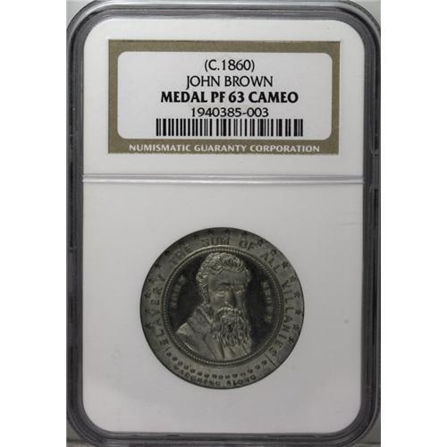 <B>1859 John Brown Medal PR63 Cameo NGC.</B></I> Sullivan-SL1859-1. White metal. 32mm. A well struck piece with brightly reflective fields and a small tan spot near the feet of the corporally punished man.<BR><I>From The Troy Wiseman Collection.</B></I>