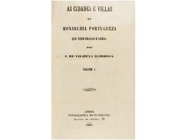 1860., LIBRO: (MILITARIA-PORTUGAL),. VILHENA BARROSA, I. DE:, AS CIDADES E VILLAS DA MONARCHIA PORTUGUEZA QUE TEEM BRASAO D´ARMAS., Lisboa: Tip. do Panorama, 1860. 4 tomos en 2 vol. en 8º. I: Vp. + 1 h. + 207 p.; II: Portada + 201 p., 2 h. III: Portada + 277 p.; IV: 126 lám. con escudos grabados. Enc. en media piel. Palau 366138.