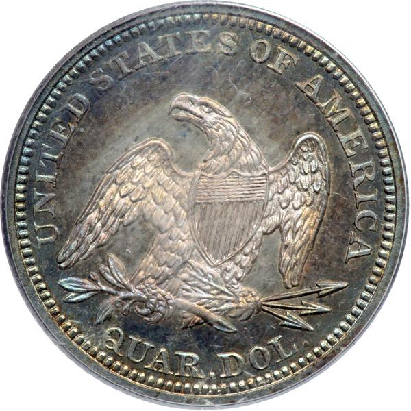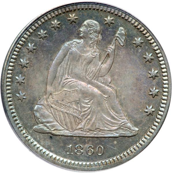 1860 Liberty Seated Quarter Dollar. PCGS graded Proof 64. CAC Approved. Lovely rainbow toning on both sides. Only 1,000 Proofs issued. A simply top-notch coin for the grade, the surfaces gyrate to-and-fro with full, multicolor vibrancy. Pop 42; 22 finer (PCGS # 5556) .
