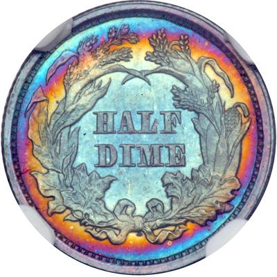 1860 Liberty Seated Half Dime. Obverse of 1859, reverse of 1860. NGC graded MS-67 J-267, Rarity-4. Wonderful blue, gold and green toning. The coin without a country! One of the more famous pattern issues, the obverse retains the 1859 and prior design with the stars surrounding Liberty, while the reverse is the new style with the larger wreath, as was adapted in 1860. The problem with the design is, there is no identifying which country issued it! Only 100 were struck, sort of as a pattern issue, but they have been included in all the mainstream collecting references for decades, such as the Guide Book, Breen's Encyclopedia and others. Hence, everyone wants one, and there are precious few to go around. PCGS has graded just a few dozen of these, and this one sits solidly within the Condition Census. In a new 4 pronged NGC holder.Pop 4; 1 finer in 68.