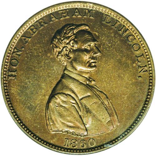 <B>1860 Lincoln Campaign Medal MS62 NGC.</B></I> Sullivan-AL-1860-41. Brass. 28mm. This medal honors Lincoln as "the rail splitter of the west," and soon the nation would be split as well. Lime-green and orange toning graces this gently shimmering and unholed example. The reverse has a scattering of tiny carbon flecks.<BR><I>From The Troy Wiseman Collection.</B></I>