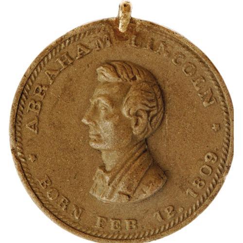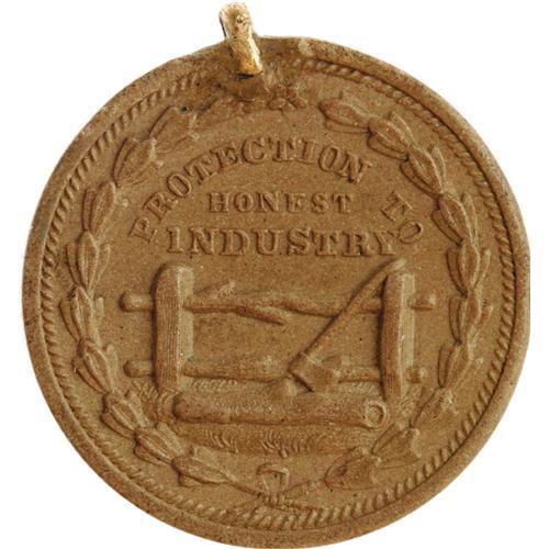 <B>1860 Abraham Lincoln "Protection To Honest Industry" Composition Medalet.</B></I> Listed as Sullivan-Dewitt AL 1860-46 and measures 27mm across. This is a very scarce medalet and is often found hanging from a small shield-shaped badge. This example is holed and has its eye still intact but no badge. The obverse features a high relief portrait of a beardless Lincoln and the reverse shows a rail fence, axe, and log, and reads "Protection To Honest Industry." In excellent, almost uncirculated condition with just a few trivial edge nicks.