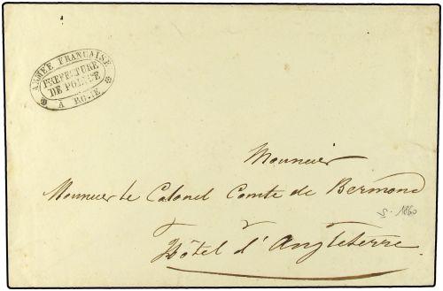 1860 Military mail envelope addressed to the Hotel Angleterre, Rome cancelled by ARMEE FRANCAISE A ROME/PREFECTURE DE POLICE oval cachet. Scarce item of military mail.