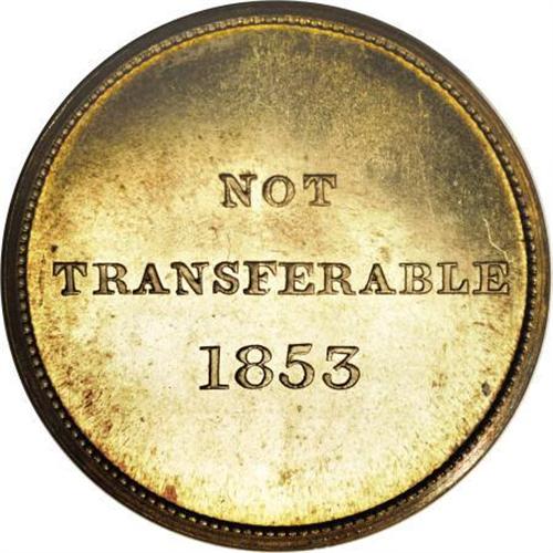 <B>1853 Mobile Jockey Club, Mobile, AL, PR63 Cameo Uncertified.</B></I> Miller-Ala-2. Brass, 28 mm. The dies apparently survived the Civil War and were used to strike numerous mules, some of which (using the reverse die) Rulau omits from his reference. He attributes these varieties to J.N.T. Levick, who presumably had a ready clientele for such productions. This example combines the original dies and has smooth, mirrored fields. Toned light honey-gold with one small spot near the M in MOBILE.<BR><BR><b>Shipping:</b> Coins & Currency (<a target="_blank" href="http://www.heritageauctions.com/common/shipping.php">view shipping information</a>)