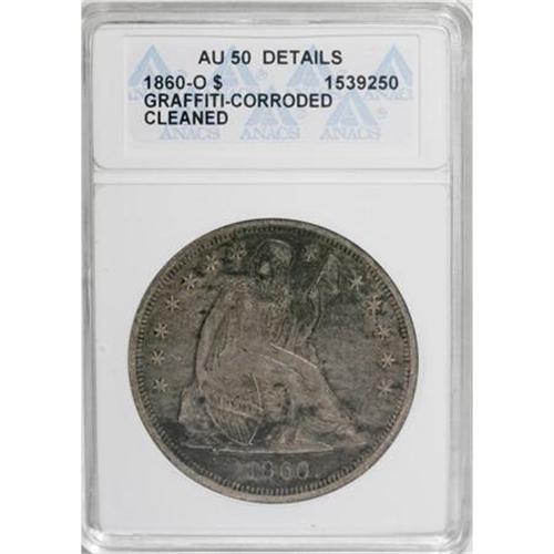 <B>1860-O $1 --Cleaned, Corroded, Graffiti--ANACS. AU50 Details.</B></I> NGC Census: (18/466). PCGS Population (46/720). Mintage: 515,000. Numismedia Wsl. Price for NGC/PCGS coin in AU50: $540. (#6950)<BR><BR><b>Shipping:</b> Coins & Currency (<a target="_blank" href="http://www.heritageauctions.com/common/shipping.php">view shipping information</a>)