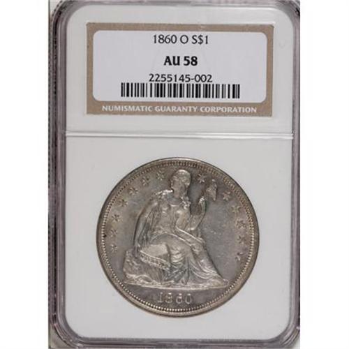 <B>1860-O $1 AU58 NGC.</B></I> Delicate gold toning visits this pleasing slider. The fields exhibit satin luster, and the strike is sharp aside from the star centers. Most 1860-O Seated dollars, even those in Mint State, are notably abraded. The present piece is only moderately bagmarked, and superior eye appeal for the grade.<BR><I>From The Leo Beranek Collection of Early Federal Coinage.</B></I><BR><BR><B>Coin Engraver:</B> Christian Gobrecht<BR><BR><b>Shipping:</b> Coins & Currency (<a target="_blank" href="http://www.heritageauctions.com/common/shipping.php">view shipping information</a>)