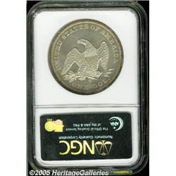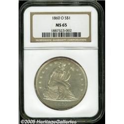 <B>1860-O<img border='0' src='http://www.heritagecoins.com/images/star.gif' width=10 height=10>$1 MS65 NGC.</B></I> As anyone who is remotely aware of 19th century type coins knows, the 1860-O Dollar is one of the two most common dates available in Mint State in the entire series. Several bags of this date surfaced in 1962, and since that time, it has remained as one of the most available (and usually most attractive) Seated Dollars in lower Uncirculated grades. But it must be understood that it is only in these lesser grades that the '60-O is a common issue. As a Gem, it ranks among several other dates in condition rarity, and, in fact, is rarer than at least three dates in this lofty grade: the 1854, 1861, and 1864. This is a stunningly beautiful coin. It resembles all other mint state '60-O Dollars with its bright, partially reflective surfaces, but here the similarities end. What it lacks are the numerous, and oftentimes distractingly large, bagmarks seen on most Dollars of this issue created by residing for a century in a mint sewn bag. There are a few small, inconsequential marks on each side, but the only flaw that deserves individual mention is a small milling mark in the reverse field above the eagle's neck. While primarily a brilliant coin, the borders are touched with just the slightest hint of crimson-red color, but this really does little to alter the perception of this dazzling coin as brilliant. Of singular importance to the date or type collector. Population: 10 in 65, 4 finer (2/05).