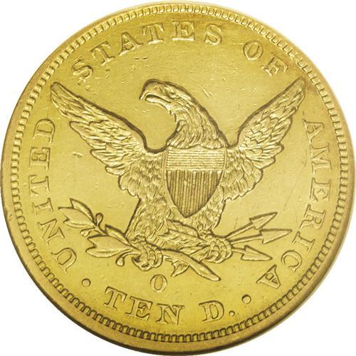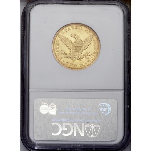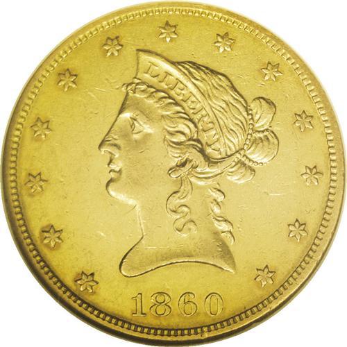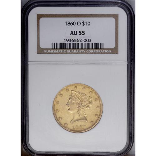 <B>1860-O $10 AU55 NGC.</B></I> A few nice AU 1860-O tens have surfaced over the past decade, suggesting the existence of a possible small hoard of this issue, probably from Jackson, Tennessee. Still, an important condition rarity with only a handful certified in AU and finer grades. The underlying brightness enhances the pronounced yellow-gold color of the coin as well as the rich reddish patina that overlays both sides. Generally well struck with an occasional bit of localized weakness. The surfaces are only moderately abraded with myriad small marks overall.