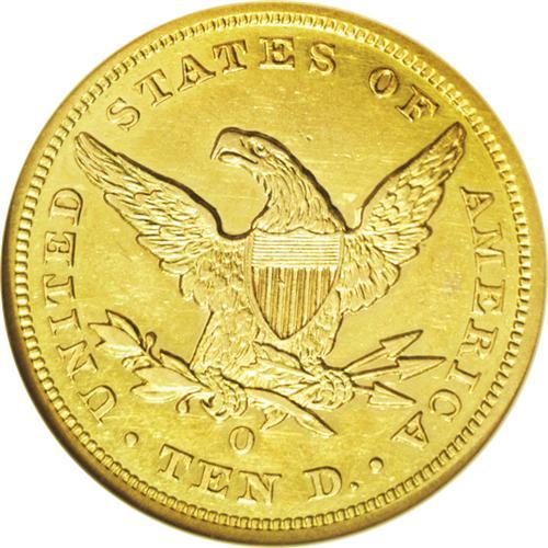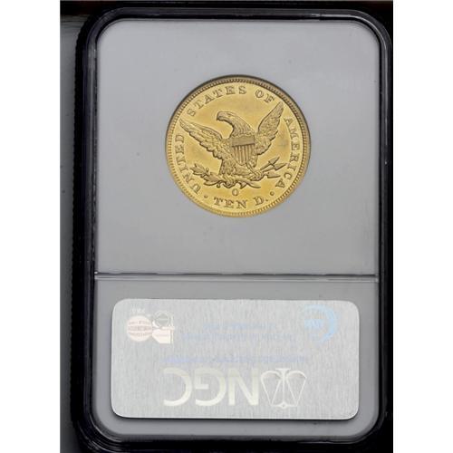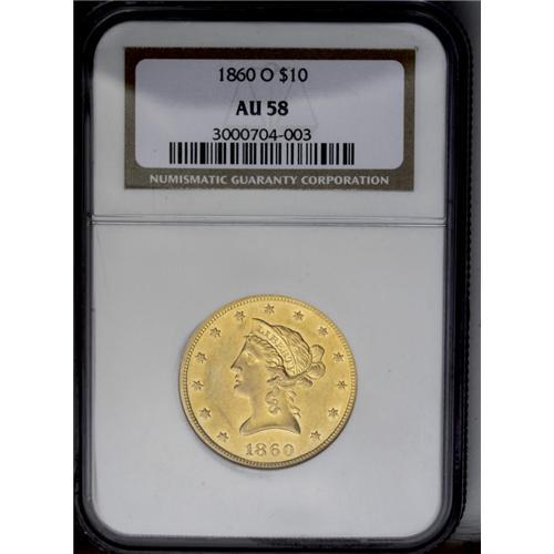 <B>1860-O<$10> AU58 NGC.</B></I> The 1860-O completed an unbroken twenty-year run of New Orleans eagle production. The Civil War prevented coinage of the denomination in 1861, although the mint did manage to strike half dollars prior to Louisiana secession. This sharp apricot-gold example displays ample prooflike luster, and although the fields exhibit faint handling, there are no identifying marks. Census: 21 in 58, 5 finer (6/06).