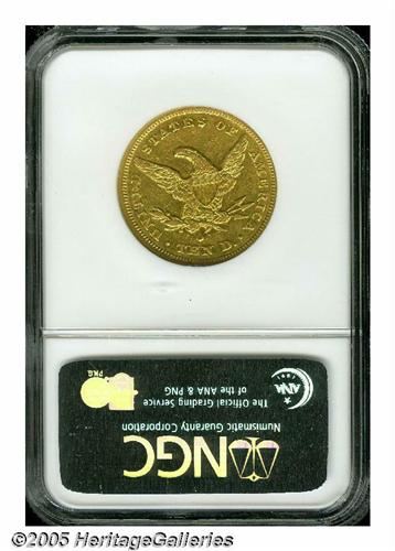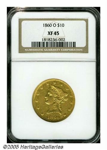 <B>1860-O<$10> XF45 NGC.</B></I> The 1860-O Eagle ended a twenty year consecutive run of New Orleans issues of the large gold denomination. It would be nearly another twenty years until the next O-mint Ten was struck, in 1879. This peach-gold representative has a good strike and only moderate wear. Luster beckons from recesses of the design. No distracting marks are present.