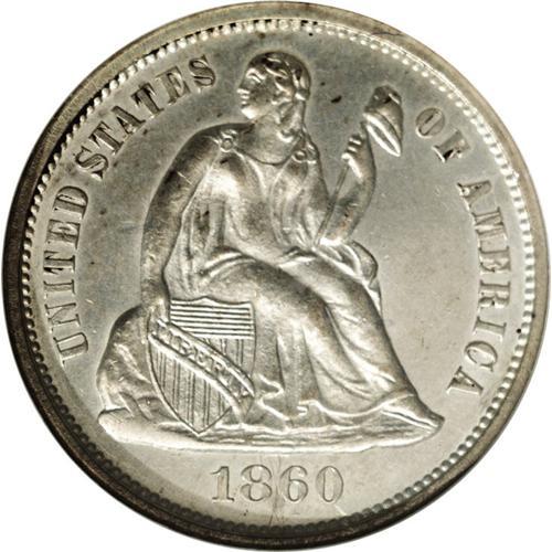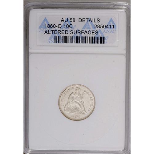 <B>1860-O<10C>--Altered Surfaces--ANACS. AU58 Details.</B></I> This is a date that is virtually impossible to locate in any grade better than VG. The present example has some unfortunate scratches by the date, and was probably lightly polished at one time, yet it has extraordinarily sharp details and excellent eye appeal. In fact, it is probably fully Mint State and still retains its luster. Highly desirable despite its challenges.