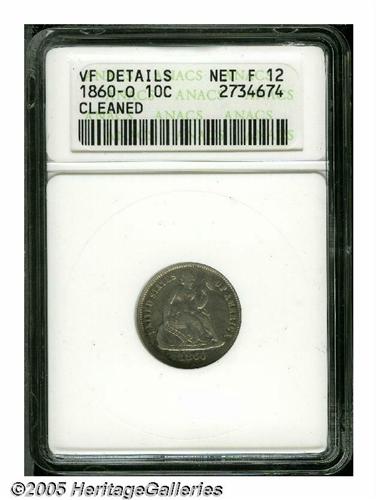<B>1860-O<10C>--Cleaned--ANACS. VF Details, Net Fine 12.</B></I> This glossy pearl-gray example displays wisps of russet patina near the borders. LIBERTY is bold, as are the corn kernels. A scant 40,000 pieces were struck. Legend Obverse Seated Dimes were struck at New Orleans only for the first and final years of the design, 1860 and 1891.<BR><I>From The Empire State Collection, Part Two.</B></I>