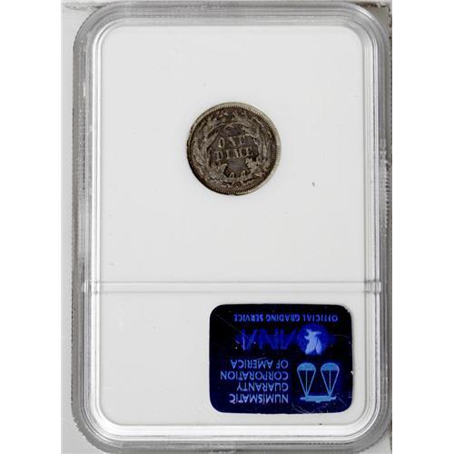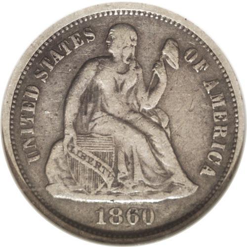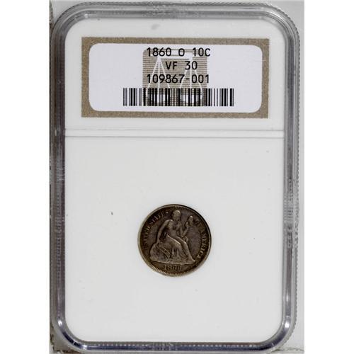 <B>1860-O<10C> VF30 NGC.</B></I> Another key in the Seated Liberty dime series, the 1860-O dimes are all known only with the small O mintmark. This example offers smoke-gray surfaces with silver-gray highpoints. Although there are 30 points of wear, there are no singularly distracting abrasions present on either side. Census: 7 in 30, 19 finer (7/06).
