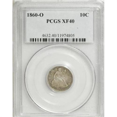 <B>1860-O 10C XF40 PCGS.</B></I> Coins that rate XF or better are genuine condition rarities for the 1860-O dime. This piece typifies what Brian Greer wrote in his 1992 book on the series: "The Type I With-Legend obverses had low relief details. This date comes sharply struck, but the details quickly wore away after a little circulation." The fields show the usual small abrasions one would expect, and each side has light gray-golden toning that deepens slightly around the margins.<BR><I>From The John Stimson, Sr. Collection, Part Two.</B></I><BR><BR><B>Coin Engraver:</B> Christian Gobrecht<BR><BR><b>Shipping:</b> Coins & Currency (<a target="_blank" href="http://www.heritageauctions.com/common/shipping.php">view shipping information</a>)