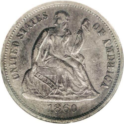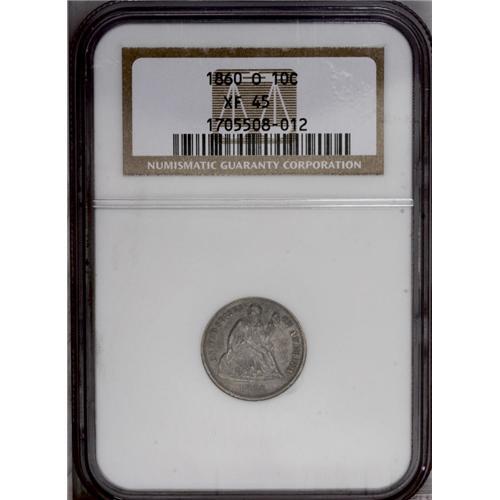 <B>1860-O<10C> XF45 NGC.</B></I> A lavender-gray example with a few moderate reverse marks and a slightly granular left obverse border. The 1860-O has an unusually low mintage of just 40,000 pieces, and most survivors are well worn. The New Orleans Mint struck Legend Obverse Seated dimes only in 1860 and 1891. By coincidence, these were the first and final years of the type. Census: 3 in 45, 7 finer (2/06).
