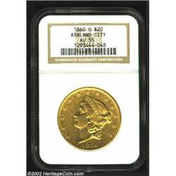 1860-O $20 AU55 NGC. Although similar in overall rarity to the 1859-O, the 1860-O is the more difficult coin to locate in grades above the Extremely Fine level. The present example and the AU58 PCGS representative in the following lot are finer than the typically offered About Uncirculated survivor. The overall definition is generally bold, although we note some incompleteness of strike on the obverse over stars 1-4, the top of Liberty's head, and the highpoints of the hair curls. Rich olive-gold undertones give way to medium intensity honey-gold shades as the coin turns directly into the light. The scattered abrasions include a moderate scrape near the reverse border after the D in the denomination that should serve as a useful pedigree marker. A similarly graded 1860-O Double Eagle in a PCGS holder realized $19,550 as lot 1738 in Bowers and Merena's October 1999 sale of the Harry W. Bass, Jr. Collection. That coin and the present representative from the Ashland City Collection both fall within the Condition Census for the issue.From the Ashland City Collection. Important notice: We expect to be auctioning lots at the rate of 200-250 per hour. Sometimes eBay Premier live bid software cannot keep up with that pace, so we strongly recommend that you place a realistic proxy bid now as insurance to avoid disappointment. Also please note that all Heritage/CAA lots purchased through eBay Premier carry a 20% Buyer's Premium. Please make sure you read the Terms and Conditions.