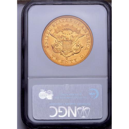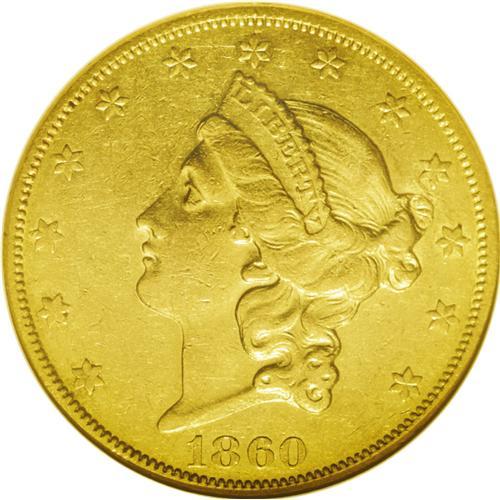 <B>1860-O<$20> AU55 NGC.</B></I> The mintage of this issue was halted after only 6,600 coins had been struck, meaning it is one of the scarcest of all Type One double eagles. Winter and Crum ranked this coins as the fifth rarest of 43 different issues in the series. They commented that: "The 1860-O is slightly less scarce than the 1859-O. It is most often seen in grades ranging from Very Fine-30 to Extremely Fine-45. An accurately graded About Uncirculated-50 represents above-average quality for this date and any piece in the middle range of AU is very rare."<BR> This example is a coin that will please the connoisseur. The surfaces have deep orange-gold color with considerable green overtones. Both sides exhibit satiny luster with much of the original prooflike surface still evident. While light abrasions have been acquired over nearly a century and a half, the surfaces do not exhibit any of the deep or distracting marks that are almost always a problem for this date. The first four stars at the left obverse are weakly defined as always. The highest elements of the design on the obverse, including much of the hair details, are also poorly defined as usual. We fully expect that this appealing example will bring a strong price in relation to the normal market levels for this date.<BR><I>From The Wyoming Collection.</B></I>