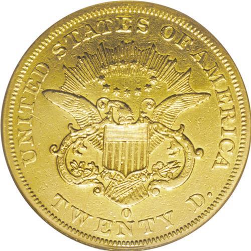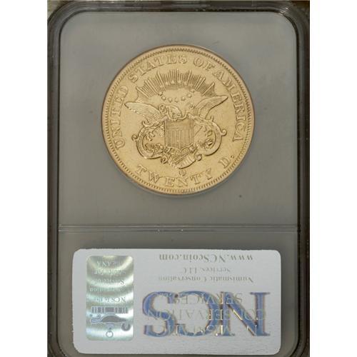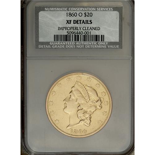 <B>1860-O $20 --Improperly Cleaned--NCS. XF Details.</B></I> A rare and desirable O-mint issue, among the rarest of the New Orleans Mint double eagles. This piece offers yellow-gold surfaces that are shiny from cleaning. However, the surfaces are quite free of abrasions or other surface impairments, unlike most examples of this issue, which are heavily bagmarked.<BR><BR><b>Shipping:</b> Coins & Currency (<a target="_blank" href="http://www.heritageauctions.com/common/shipping.php">view shipping information</a>)