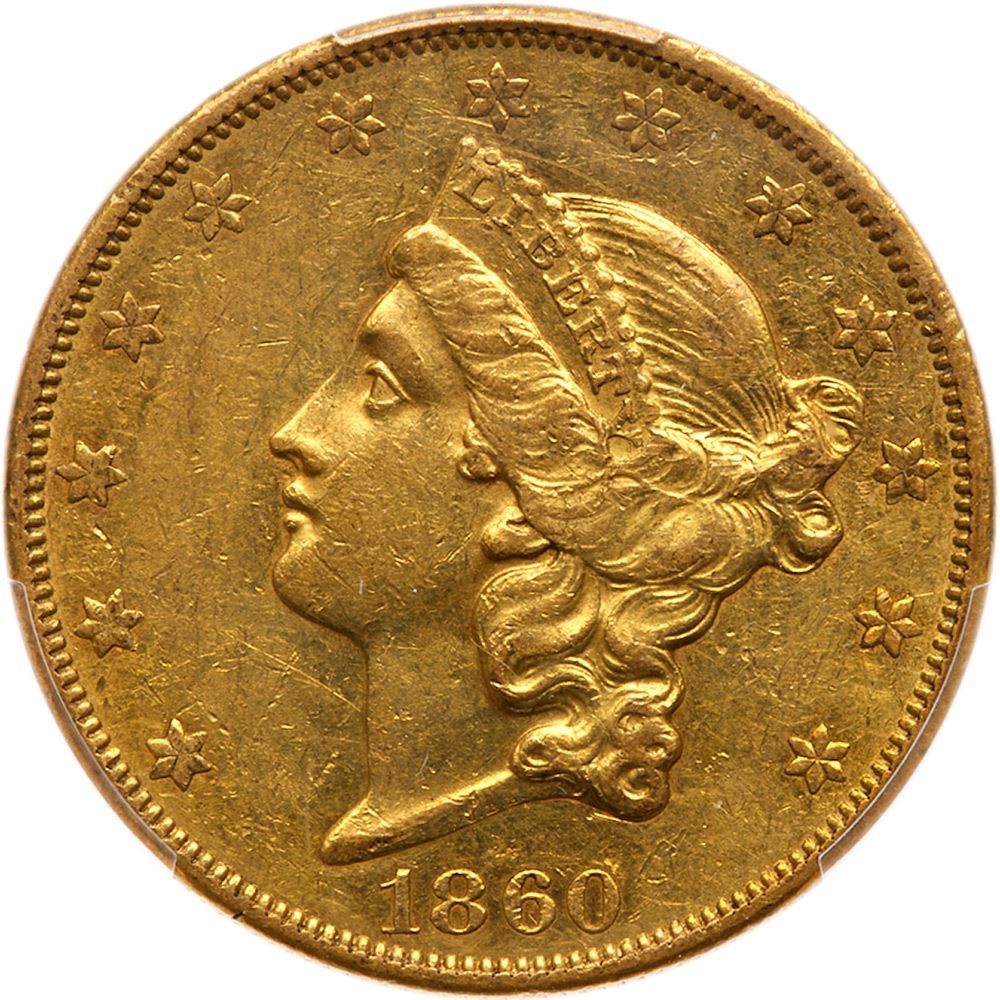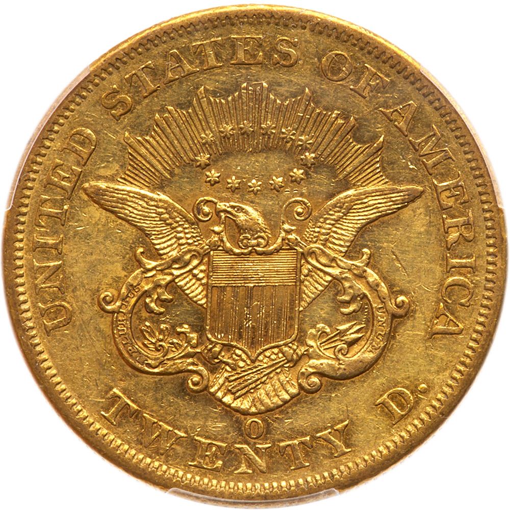 1860-O. PCGS graded AU-53. Lightly toned with some mint luster visible on both sides., and rather attractive for this notoriosly challenging issue to find with any decent eye appeal. Most of these circulated hard and became heavily abraded from even limited circulation. Here is one of the nicer exceptions to that rule where Libertys face, neck and cheek show only a few minor scuffs and nicks and lack the usual barrage of heavy indentations from bag handling or hard years in commerce.