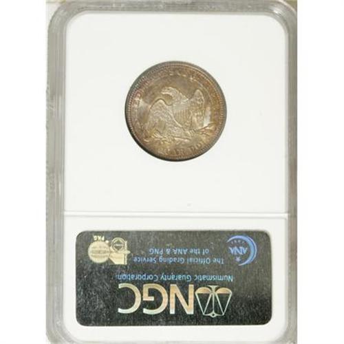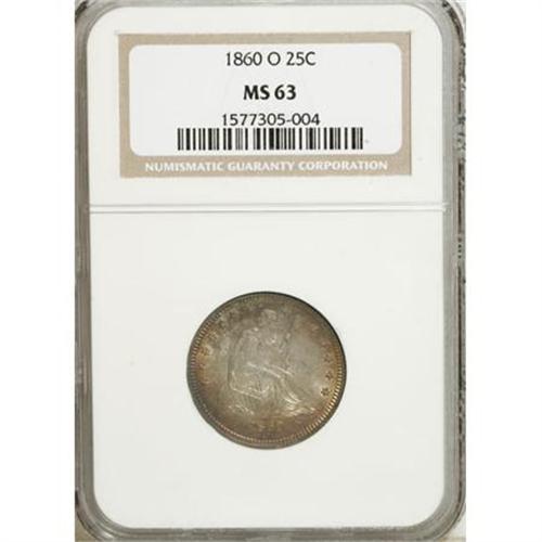 <B>1860-O 25C MS63 NGC.</B></I> An amazing piece, approaching the finest quality known for the date. NGC has only certified 10 of these in MS63, with a mere 12 finer pieces. This example has satiny gray luster with gorgeous gold toning.<BR><BR><B>Coin Engraver:</B> Christian Gobrecht<BR><BR><b>Shipping:</b> Coins & Currency (<a target="_blank" href="http://www.heritageauctions.com/common/shipping.php">view shipping information</a>)