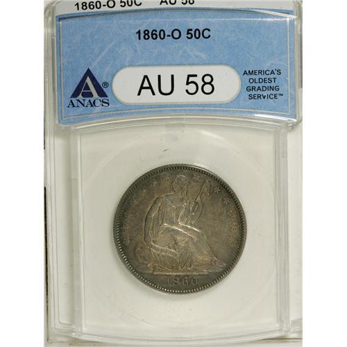 <B>1860-O 50C AU58 ANACS.</B></I> NGC Census: (21/98). PCGS Population (17/82). Mintage: 1,290,000. Numismedia Wsl. Price: $300. (#6300)<BR><BR><b>Shipping:</b> Coins & Currency (<a target="_blank" href="http://www.heritageauctions.com/common/shipping.php">view shipping information</a>)