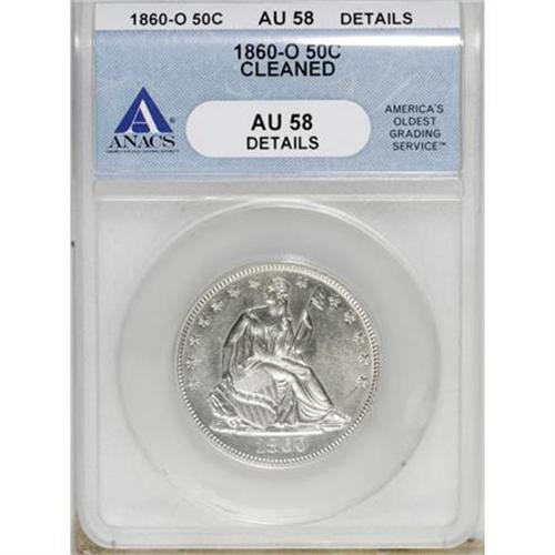 <B>1860-O 50C --Cleaned--ANACS AU58 Details.</B></I> NGC Census: (22/99). PCGS Population (18/86). Mintage: 1,290,000. Numismedia Wsl. Price for NGC/PCGS coin in AU58: $375. (#6300)<BR><BR><B>Coin Engraver:</B> Christian Gobrecht<BR><BR><b>Shipping:</b> Coins & Currency (<a target="_blank" href="http://www.heritageauctions.com/common/shipping.php">view shipping information</a>)