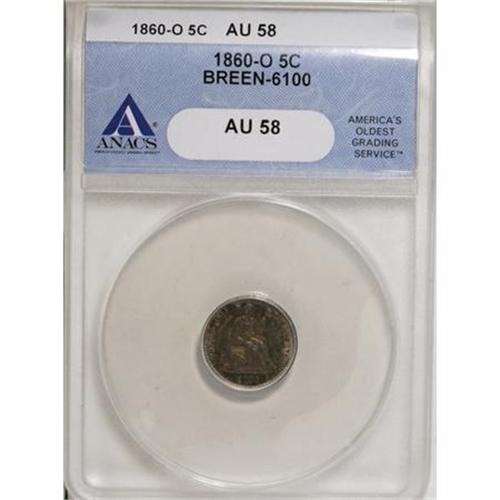 <B>1860-O H10C AU58 ANACS.</B></I> Breen-6100. NGC Census: (13/152). PCGS Population (16/133). Mintage: 1,060,000. Numismedia Wsl. Price for NGC/PCGS coin in AU58: $110. (#4378)<BR><I>From The Al Blythe Collection of Half Dimes.</B></I><BR><BR><B>Coin Engraver:</B> Christian Gobrecht<BR><BR><b>Shipping:</b> Coins & Currency (<a target="_blank" href="http://www.heritageauctions.com/common/shipping.php">view shipping information</a>)