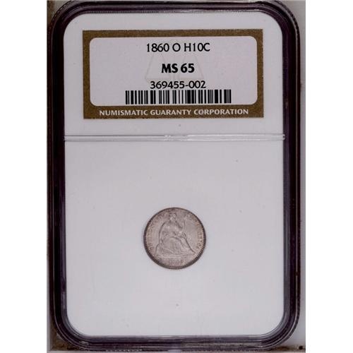 <B>1860-O<H10C> MS65 NGC.</B></I> Very sharply struck for a New Orleans product, the satiny surfaces are overlaid with gray-golden toning. A premium example of this important first-year issue. <BR><BR><B>Important notice:</B> Heritage usually auctions material at the rate of 200-250 lots per hour. On some occasions eBay Live bid software or the Internet may not be able to keep up with the pace of the auction. We recommend placing a realistic absentee bid now as insurance to avoid disappointment. Occasionally the auctioneer may eliminate or reject an eBay Live bid, and the auctioneer may also reopen a lot after the close of the eBay live bidding (usually because we missed an audience bid), and may reject your bid even if it shows you as the winning bidder. By bidding via eBay Live, you agree that Heritage may award the lot to another bidder at its sole discretion under the circumstances described above or any other reasonable circumstances. Since eBay bids are not shown to us until we open the lot on the floor, we treat those bids just like floor bids. In most cases the floor responds before the eBay bid is presented to us, due to Internet lag time, so for consistency we have made it a policy that floor bids are always considered first over tie eBay live bids. Also please note that all Heritage lots purchased through eBay Live carry a 20% Buyer's Premium. Please make sure you read the Terms and Conditions before you bid. This lot is being auctioned in conjunction with a live floor auction by Heritage Galleries & Auctioneers. All final auction and invoice information will be supplied by Heritage Galleries & Auctioneers, and all other information should be considered preliminary. Lot:1901 <BR><BR><B>Winning Notification and Billing:</B> After the FINAL session in this auction is complete, Heritage will send e-mail and snail mail invoices. This process normally takes several days. All final auction and invoice information will be supplied by Heritage Galleries & Auctioneers, and all other information should be considered preliminary. <BR><BR>This auction will be conducted on a live auction floor and over the Internet through eBay Live. If you choose to place an absentee bid, please take a moment to <font color='#0000ff'><u><a href='http://pages.ebay.com/liveauctions/help/before/laabsentee.html'>learn how eBay Live absentee bidding works</a></u></font><font color='#000000'>